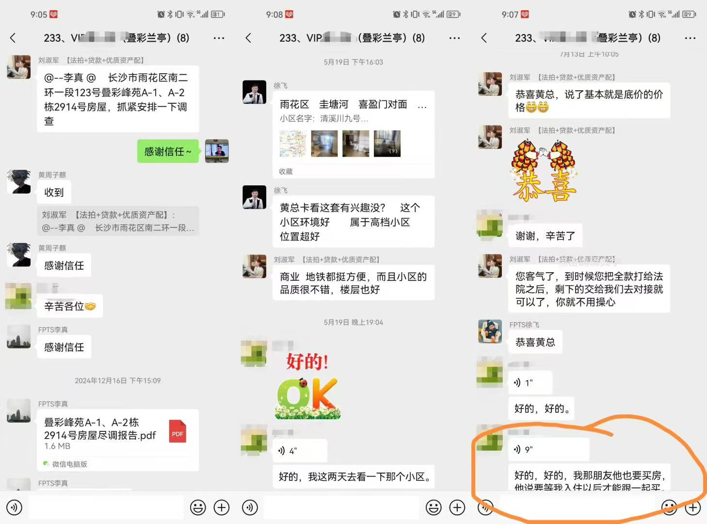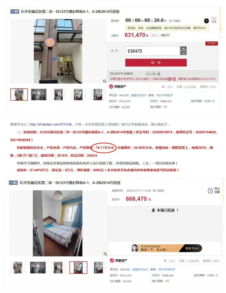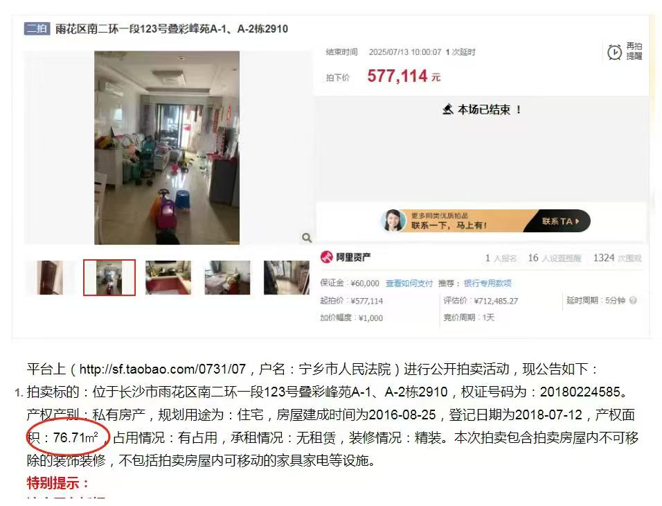 (圖7)黃總是我公司(湖南法拍網法拍房地產經紀有限公司)第233個VIP客戶,去年12月簽約的,當時就是沖著拍疊彩峰苑的2914來的(圖5),結果51萬起拍,8個人搶,拍到66萬去了,沒拍贏,然后就慢慢的又繼續(xù)看別的,看到現(xiàn)在終于又等到了這一套,還是29樓,2910,這次沒人競爭了,直接57.5萬底價拿下,比上一套便宜近9萬塊錢,真香,哈哈哈。