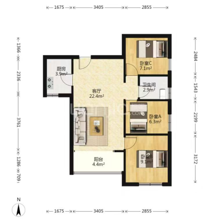 房子77平,沒公攤,精裝三房(圖2戶型),二拍57.5萬底價成交,精裝單價才7490元一平。